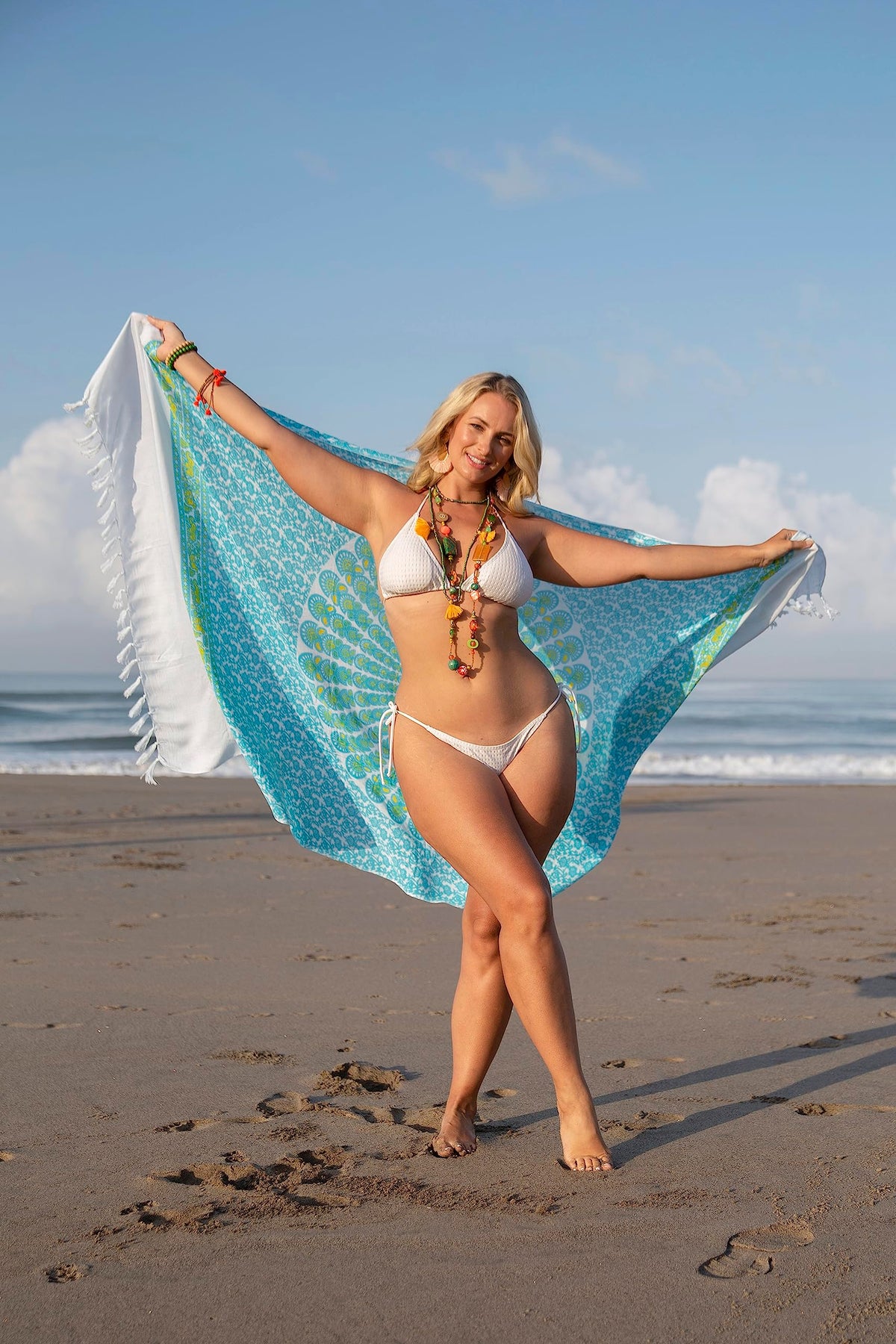 LOOK RADIANT IN THIS PLUS SIZE PEACOCK PAREO BEACH SARONG COVER UP, centered with a rippling circular mandala in a vibrantly hued exotic feather motif